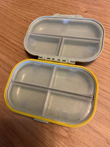 Kassi með sjö hólfum fyrir mismunandi hluti. Hér er hægt að setja pillur, vítamín eða litla eyrnalokka.