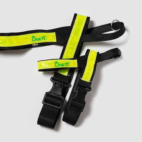 Svart sporabeisli úr 4 cm nylonborða með gulu endurskini og handföng með taumhring á.