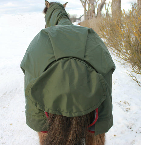 Regnábreiðu með krossgjörð undir kvið og flipi yfir taglið.